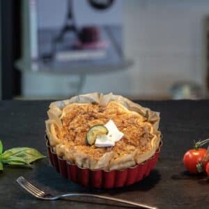 Blätterteig, Eier, Crème fraîche, Sahne, Paprika, Tomaten, Gruyère, Lauch, Zwiebeln, Muskat (je nach Jahreszeit: Zucchini, Pilze).